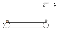 、不可伸长的轻绳悬挂一质量为0.2kg的小球,小球与传送带上表面平齐但不接触。在O点右侧的P点固定一钉子,P点与O点等高。将质量为0.1kg的小物块无初速轻放在传送带左端,小物块运动到右端与小球正碰,碰撞时间极短,碰后瞬间小物块的速度大小为