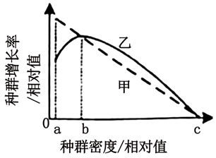 18. 种群增长率等于出生率减死亡率。不同物种的甲、乙种群在一段时间内的增长率与种群密度的关系如图所示。已知随时间推移种群密度逐渐增加,a为种群延续所需的最小种群数量所对应的种群密度;甲、乙中有一个种群个体间存在共同抵御天敌等种内互助。下列说法正确的是( )