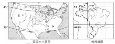 (2)美国本土和巴西因地理位置和地形不同,导致气候差异巨大,美国本土以温带大陆性气候为主,巴西热带雨林气候和_____________气候分布广泛。