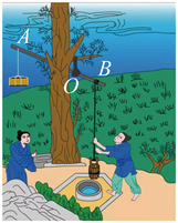 8. 桔槔是《天工开物》中记载的一种原始的汲水工具,在拗石辅助下,人几乎可以不用力就能将一桶水从井中提起。如图所示,已知A点所挂拗石重力为100N,