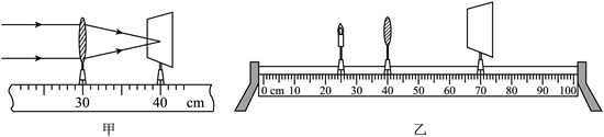 (1)将凸透镜安装在光具座上,用平行光作为光源,移动光屏直至光屏上得到一个最小最亮的光斑,如图甲所示,则凸透镜焦距为______cm;(要求估读)
