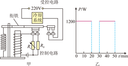 28. 如图甲是科技小组设计的“智能温控小屋”简化电路,受控电路功率随时间的变化关系如图乙所示。当室温上升至28℃时冷却系统开始工作,当室温降至23℃时停止工作。Rt为热敏电阻,其阻值随温度的升高而减小,当控制电路中的电流为0.15A时,衔铁刚好被吸下,控制电路电源电压恒为3V。定值电阻R0为100Ω,线圈电阻忽略不计。求: