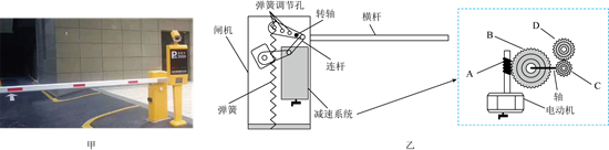 为让横杆平稳起落,需给电动机进行减速,减速系统内部结构如图乙所示。首先电动机通过转轴末端的单头蜗杆A(相当于齿数为1的齿轮)带动蜗轮B实现第一次减速;接着与蜗轮同轴的齿轮C再带动与之啮合的齿轮D,实现第二次减速,横杆通过连杆实现起降。减速比是描述减速程度的重要参数,可用后一个齿轮的齿数与前一个齿轮齿数的比值来计算。该闸机的第一次减速比应该为蜗轮B的齿数与1的比值,若数值为