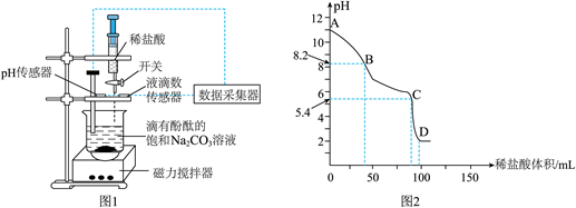 随滴入稀盐酸体积的变化关系如图2所示。实验中发现A~B段对应烧杯中无气泡产生,B点后逐渐有气泡冒出,C点后几乎无气泡。
