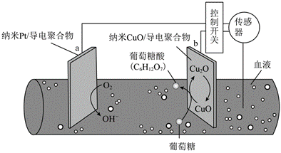 12. 一种可植入体内的微型电池工作原理如图所示,通过CuO催化消耗血糖发电,从而控制血糖浓度。当传感器检测到血糖浓度高于标准,电池启动。血糖浓度下降至标准,电池停止工作。(血糖浓度以葡萄糖浓度计)