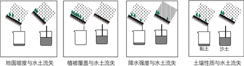 为了探究我国黄土高原某区域水土流失问题,潘博士组织学校地理兴趣小组设计了“探究各要素在不同情况下对水土流失的影响”的探究实验(下图)。据此完成下面小题。