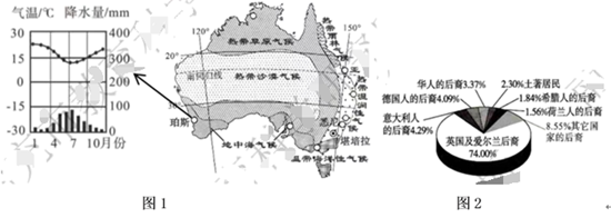 材料二图1为澳大利亚气候和主要城市分布示意图,图2为澳大利亚居民构成示意图。