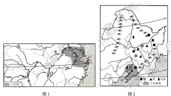 13. 长江中下游地区(图1)和东北地区(图2)发展工农业的基础较好,两地区不仅工业发展各具特色,还是我国重要的粮食主产区,有效保障了我国的粮食安全。据此完成下列问题。