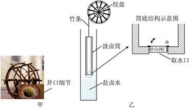 21. 遂宁大英的卓筒井被誉为“世界近代石油钻井之父”,是手工制盐的活化石。从井中提取盐卤水是制盐过程中的关键环节,其装置如甲图所示。某科创小组制作了一个模型来模拟提取过程,如乙图所示,图中的竹制汲卤筒顶端开口,底部装有硬质单向阀门;竹条具有韧性,对汲卤筒可以产生压力或拉力。汲卤筒在盐卤水中下降时单向阀门绕O点转动打开,盐卤水进入筒中;当汲卤筒上升时,单向阀门绕O点转动关闭。已知汲卤筒的高2m,质量2.4kg,密度