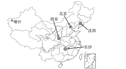 2024年春节联欢晚会于大年三十20点(北京时间)准时开播,四个分会场分别设在辽宁的沈阳、湖南的长沙、陕西的西安、新疆的喀什。开播时的沈阳已是万家灯火,而喀什还处在落日余晖之中。图为春晚会场分布示意图,据此完成9~11题。
