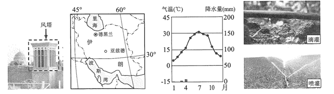 29.伊朗亚兹德的传统建筑——风塔(图1),被誉为当地的“消暑神器”。图2为亚兹德位置示意图,图3是该地的气温曲线和降水柱状图,图4是该地农业景观图,据此完成下列各题。(5分)