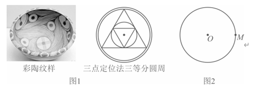 20. 马家窑文化以发达的彩陶著称于世,其陶质坚固,器表细腻,红、黑、白彩共用,彩绘线条流畅细致,图案繁缛多变,形成了绚丽典雅的艺术风格,创造了一大批令人惊叹的彩陶艺术精品,体现了古代劳动人民的智慧.如图1的彩陶纹样呈现的是三等分圆周,古人用等边三角形三点定位的方法确定圆周的三等分点,这种方法和下面三等分圆周的方法相通.如图2,已知