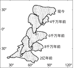 在地球内力的驱动下,印度古陆漂洋过海,经历了地质历史上漫长的漂泊,终于到达现今位置。下图示意2亿年以来印度古陆不同时期的经纬度位置。据此完成下面小题。