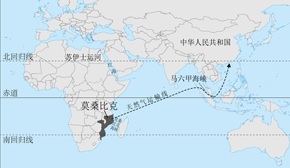 11. 莫桑比克大型海上浮式液化天然气项目,是我国参与建设的海外重点工程。该项目集成先进的超深海液化天然气技术,可开采海平面以下2000米内岩层中的天然气资源。2023年该项目持续稳产增产,不仅促进了该国社会经济发展,也拓宽了我国能源进口渠道。下图示意莫桑比克天然气运往我国的某条海上运输线。据此完成下列问题。