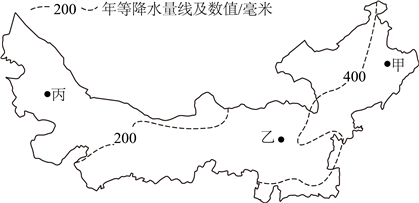 12. 内蒙古自治区资源丰富,不同区域有各具特色的优美风景。暑假,安徽省某中学研学小组对内蒙古自治区甲、乙、丙三地进行考察。下图示意内蒙古自治区年平均降水量分布及景观,图中①②③为研学小组在三个考察地拍摄的典型景观照片。据此完成下列问题。