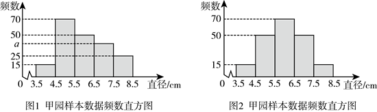 整理样本数据,并绘制甲、乙两园样本数据的频数直方图,部分信息如下: