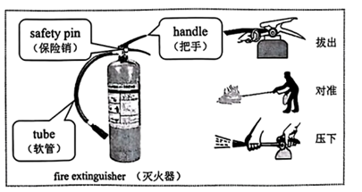 When we use a fire extinguisher, we should first shake it after picking it up, and then pull off the safety pin quickly. As soon as we point the tube at the root of the fire, we are expected to press down on the handle until we put out the fire. During the period, we should be careful enough not to get hurt.