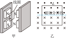 4. 电磁俘能器可在汽车发动机振动时利用电磁感应发电实现能量回收,结构如图甲所示。两对永磁铁可随发动机一起上下振动,每对永磁铁间有水平方向的匀强磁场,磁感应强度大小均为B.磁场中,边长为L的正方形线圈竖直固定在减震装置上。某时刻磁场分布与线圈位置如图乙所示,永磁铁振动时磁场分界线不会离开线圈。关于图乙中的线圈。下列说法正确的是( )