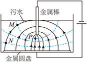 8. 污水中的污泥絮体经处理后带负电,可利用电泳技术对其进行沉淀去污,基本原理如图所示。涂有绝缘层的金属圆盘和金属棒分别接电源正、负极、金属圆盘置于底部、金属棒插入污水中,形成如图所示的电场分布,其中实线为电场线,虚线为等势面。M点和N点在同一电场线上,M点和P点在同一等势面上。下列说法正确的有( )