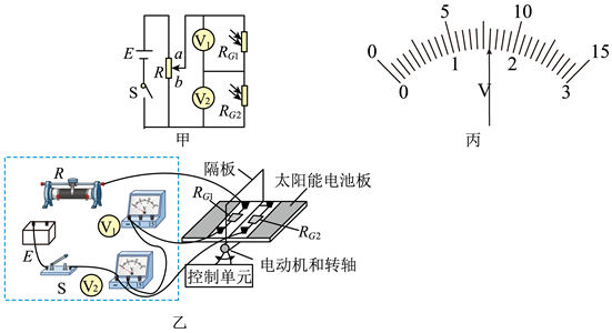 12. 某科技小组模仿太阳能发电中的太阳光自动跟踪系统,制作光源跟踪演示装置,实现太阳能电池板方向的调整,使电池板正对光源。图甲是光照方向检测电路。所用器材有:电源E(电动势3V)电压表(V1)和(V2)(量程均有3V和15V,内阻均可视为无穷大):滑动变阻器R:两个相同的光敏电阻
