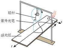 6. 如图,一电动机带动轻杆在竖直框架平面内匀速转动,轻杆一端固定在电动机的转轴上,另一端悬挂一紫外光笔,转动时紫外光始终竖直投射至水平铺开的感光纸上,沿垂直于框架的方向匀速拖动感光纸,感光纸上就画出了描述光点振动的