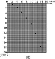 12. 图1为探究平抛运动特点的装置,其斜槽位置固定且末端水平,固定坐标纸的背板处于竖直面内,钢球在斜槽中从某一高度滚下,从末端飞出,落在倾斜的挡板上挤压复写纸,在坐标纸上留下印迹.某同学利用此装置通过多次释放钢球,得到了如图2所示的印迹,坐标纸的y轴对应竖直方向,坐标原点对应平抛起点.