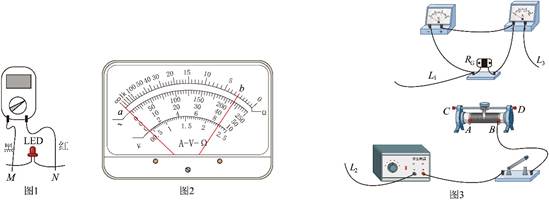 ”欧姆挡测量二极管的电阻。如图1所示,当黑表笔与接线端M接触、红表笔与接线端N接触时,多用电表指针位于表盘中a位置(见图2);对调红、黑表笔后指针位于表盘中b位置(见图(2),由此判断M端为二极管的____________(填“正极”或“负极”)。