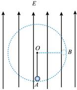 14. 如图,竖直向上的匀强电场中,用长为L的绝缘细线系住一带电小球,在竖直平面内绕O点做圆周运动。图中A、B为圆周上的两点,A点为最低点,B点与O点等高。当小球运动到A点时,细线对小球的拉力恰好为0,已知小球的电荷量为