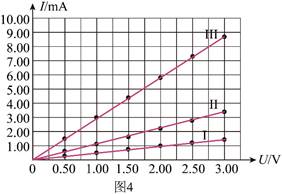 ②图4为不同光照强度下得到的光敏电阻伏安特性图3曲线,图中曲线Ⅰ、Ⅱ和Ⅲ对应光敏电阻受到的光照由弱到强。由图像可知,光敏电阻的阻值随其表面受到光照的增强而____________(填“增大”或“减小”)。