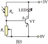 (3)组装光强报警器电路并测试其功能图5为利用光敏电阻、发光二极管、三极管(当b、e间电压达到一定程度后,三极管被导通)等元件设计的电路。组装好光强报警器后,在测试过程中发现,当照射到光敏电阻表面的光强达到报警值时,发光二极管并不发光,为使报警器正常工作,应____________(填“增大”或“减小”)可调电阻