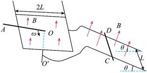 15. 如图,边长为是角的平行导轨通过导线分别与细框及导体轴相连。导轨和细框分别处在与各自所在平面垂直的匀强磁场中,磁感应强度大小均为B。足够长的细导体棒