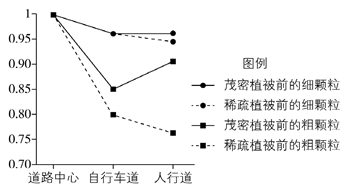 某大都市城市用地紧缺,道路与居民区距离较近,交通排放颗粒物对居民区有一定的影响,绿化植被可减轻此影响。在该都市采样监测发现,不同植被类型对颗粒物的拦截效果不同。如左图示意采样监测区基本情况。右图显示道路中心、自行车道、人行道与道路中心的颗粒物浓度的比值。据此完成下面小题。