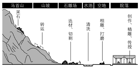 山西省新绛县西庄村附近盛产青石,自宋代以来形成了以石雕加工为主的传统手工业。为保持行业的家族垄断优势,当地主要采取子承父业的技艺传承方式。近年来,在政府扶持下,西庄村规划建设了石雕工业园。如图示意农耕时代西庄村石雕生产的空间次序。据此完成下面小题。