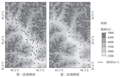 2019年9月17—18日西藏林芝地区出现了两次强降雨。研究表明,深入谷地的季风为该地降雨提供了充足的水汽,山谷风影响了降雨的时空变化,使降雨呈现明显的时段特征。如图示意两次强降雨时距地面10米处的风向与风速。据此完成下面小题。