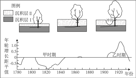 美国西南部某河源的小型谷地,气候较干旱。该地品尼松生长缓慢,分枝点低,雨水下渗为其生长提供水源,外力作用会影响其生长状态。1905年后该地降水增多。如图示意谷底的品尼松生长演变过程,以及相应的年轮增长距平值。据此完成下面小题。
