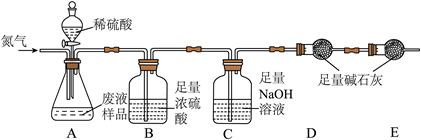 兴趣小组设计了如下图所示的实验,取100g废液样品放入装置A的锥形瓶中,先通入一会儿N2,然后称量装置C、D的质量,再向锥形瓶中滴加足量稀硫酸,至不再产生气体,继续通一会儿N2后,测得装置C、D分别增重2.1g和0.1g。