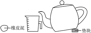 ①如图,把茶壶的一侧垫起并装满水,将橡皮泥轻轻放入茶壶中,用量杯接住溢出的水;