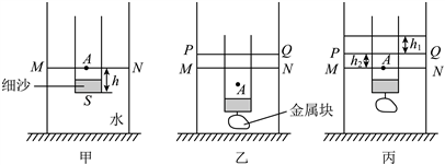 23. 某兴趣小组要测量一金属块的密度,设计了如下方案:将装有适量细沙的薄壁圆筒,缓慢竖直放入盛有适量水的、水平放置的长方体透明薄壁容器中,待圆筒静止后,在圆筒上对应水面的位置标记一点A,并在长方体容器上标出此时的水位线MN(如图甲所示);然后将待测金属块用细线悬挂在圆筒下方,缓慢竖直放入水中,圆筒静止后(金属块不接触容器底部),在长方体容器上标出此时的水位线PQ(如图乙所示);再向长方体容器中缓慢注水至圆筒上的A点与MN在同一水平面上(如图丙所示)。测出PQ与此时水面的距离为