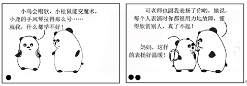 图中小熊猫没有小鸟、小松鼠的本领,他妈妈说:“可是老师也表扬你了,说你在每一个同学表演的时都用力鼓掌,说你懂得欣赏别人,很棒!”其实,小熊猫自己也有自己的闪光点,别的同学用力表演时,总在给他人“搭台捧场”,说鼓励的话语,这是欣赏别人,更是悦纳自己价值的一种肯定,因为我们每个人都是独一无二的存在。