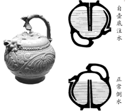 注:该壶利用了虹吸原理,注水孔在壶底,注水时,水并不会从壶嘴流出。水壶翻转后,水也不会从壶底漏出,只有当壶身向壶嘴处倾斜时,水才会自然流出,这增加了壶的密封性和便携性,后来该类壶普遍流行。