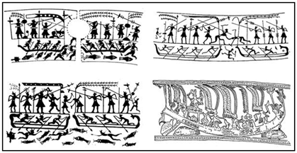 材料一 战国时期,造船技术有较大进步。船的种类很多,有运输船、战船等。图是战国铜壶壶身刻有的水陆攻战图案。从图中看出,那时的人们已用长桨划船。