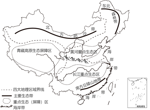 为建设美丽中国,守住自然生态安全边界,“十四五”时期我国提出“三区四带”重点区域生态屏障建设。读“重要生态系统保护和修复布局示意图”,完成下面小题。