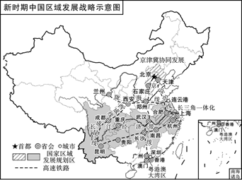 我国“十四五”规划和二○三五年远景目标提出“深入实施区域重大战略”,提升区域引领带动能力,推动区域重大战略取得突破性进展,促进区域间融合互动、融通补充。读“新时期我国区域发展战略示意图”,完成下面小题。