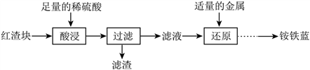 18. 陶瓷是火与土的结晶,是化学与艺术的融合,是中华文明的象征之一。颜料赋予陶瓷精彩。一种用焙烧黄铁矿产生的红渣块(主要成分为Fe2O3和SiO2,SiO2不溶于水和常见的酸)为原料制备颜料铵铁蓝的工艺流程如图: