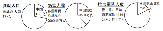 【详解】根据题干信息可知,参战总人口17亿,中国占4.5亿;各国军民总共伤亡9000余万人,中国伤亡3500万人;德、意、日法西斯军队1110万人(1941年),中国抗日军240万人。通过这些数据占比可知,中国战场是世界反法西斯战争的东方主战场,对世界反法西斯战争的胜利、维护世界和平作出了巨大贡献,D项正确;全民族团结才能取得抗日战争的胜利和中国人民的抗战得到了世界各国援助,是抗日战争取得胜利的原因,与题干强调的影响不符,排除AB项;中国抗战是近代以来抗击侵略的第一次完全胜利,属于抗日战争的国内影响,与题干强调的是国际影响不符,排除C项。故选D项。