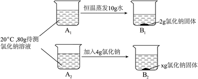 15. 小明同学在测定某氯化钠溶液中溶质的质量分数时,用两只烧杯各取80g待测溶液分别进行了如下实验。已知20℃时,氯化钠的溶解度为36g。