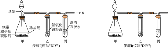 (1)步骤I是向镁带和少量碳酸钙的混合物中加入稀盐酸后关闭分液漏斗的活塞,如上图所示。实验中,观察到甲中镁带逐渐减少,碳酸钙逐渐消失,乙和丙中始终只有无色气泡,再无其他明显现象。则气体X是________,乙中反应的化学方程式为________。