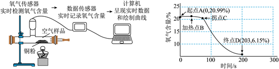 10. 为探究铜的化学性质,某同学借助氧气传感器在密闭装置中进行下图所示实验,观察实验现象并分析氧气含量随时间变化的曲线图。其中终点D(203,6.15%)表示时间为203秒时,装置中氧气含量为6.15%。结合图示判断下列说法错误的是