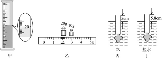 ②将金属片和柱形容器从水中取出并擦干,再将它们放入在家配制的盐水中,稳定后处于竖直漂浮状态,如图丁所示,测出此时柱形容器露出液面高度为5.8cm;
