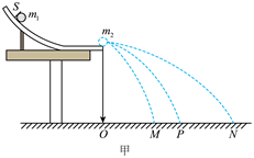 (2)图甲中O点是小球抛出点在地面上的垂直投影,首先,将质量为m1的小球从斜槽上的S位置由静止释放,小球落到复写纸上,重复多次。然后,把质量为m2的被碰小球置于斜槽末端,再将质量为m1的小球从S位置由静止释放,两球相碰,重复多次。分别确定平均落点,记为M、N和P(P为m1单独滑落时的平均落点)。